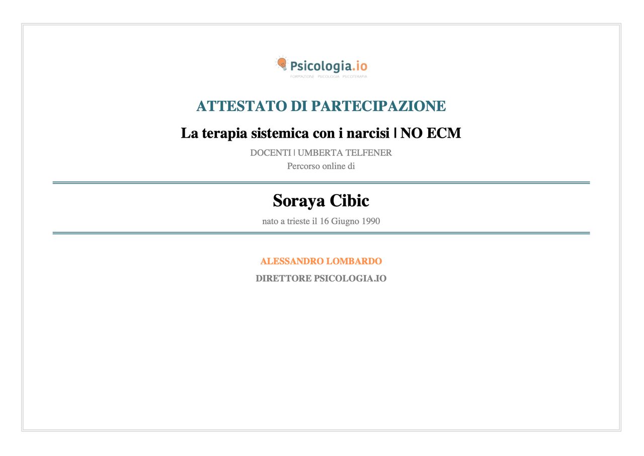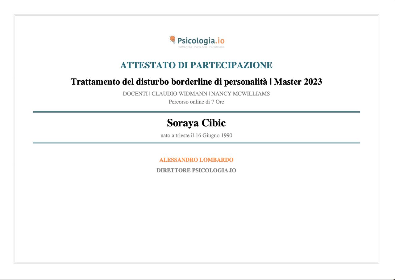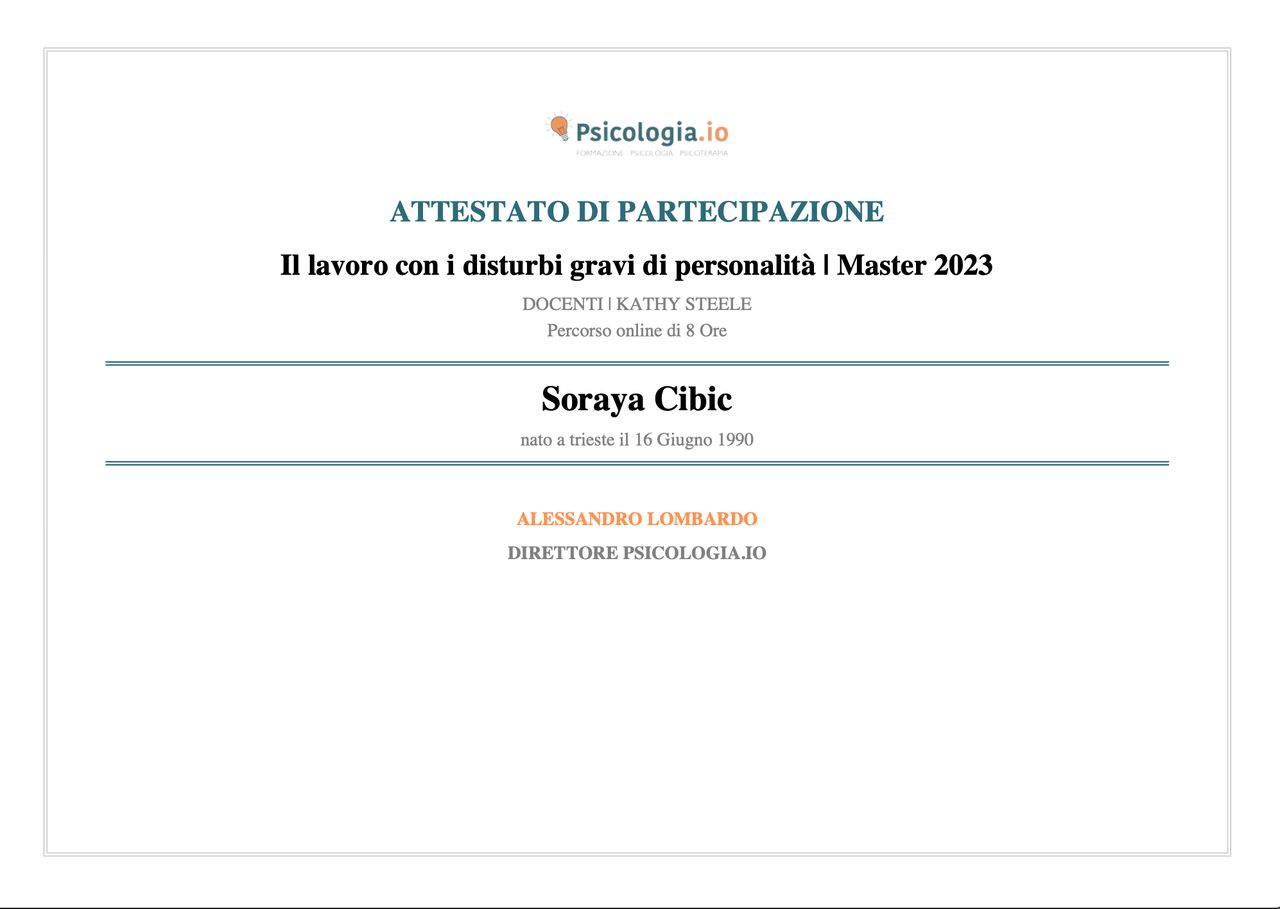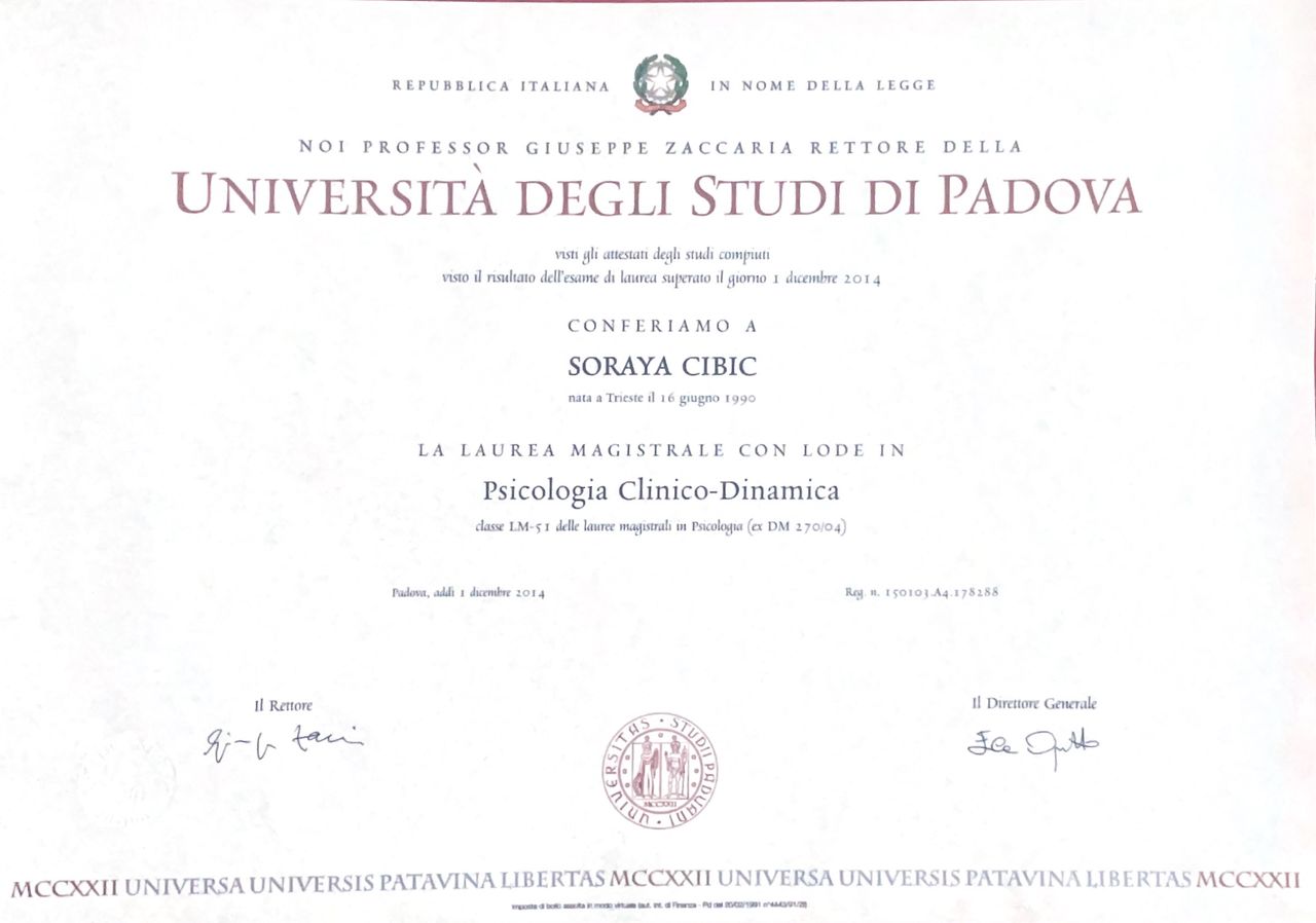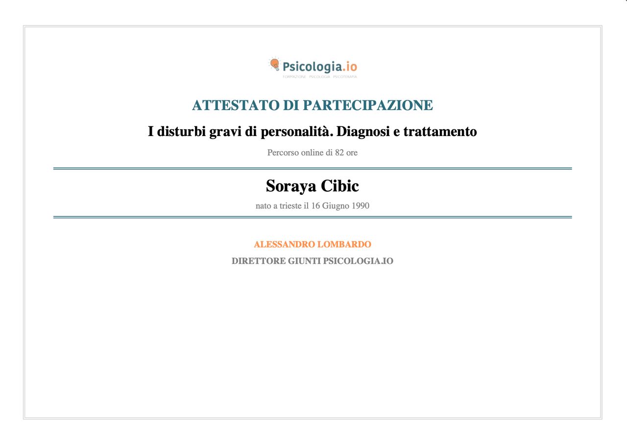 Sono la Dott.ssa Soraya Cibic, psicologa e psicoterapeuta.