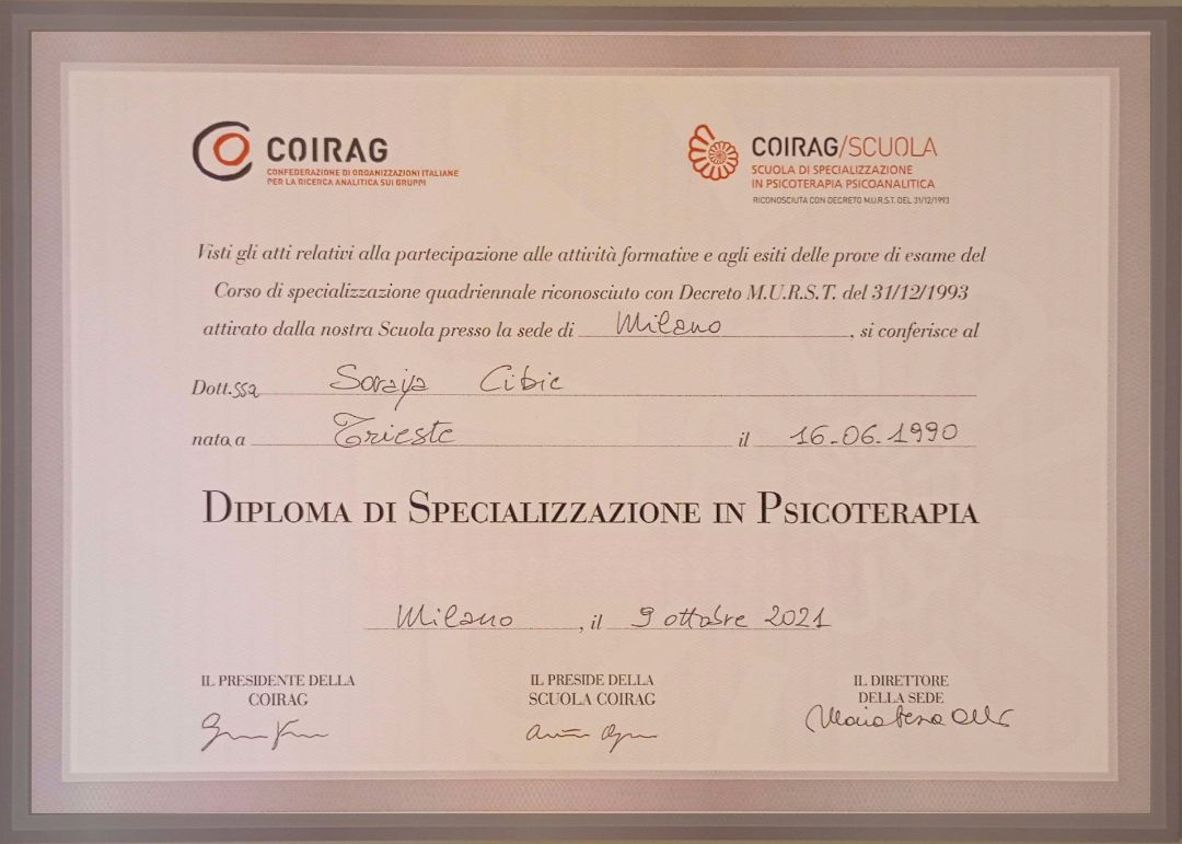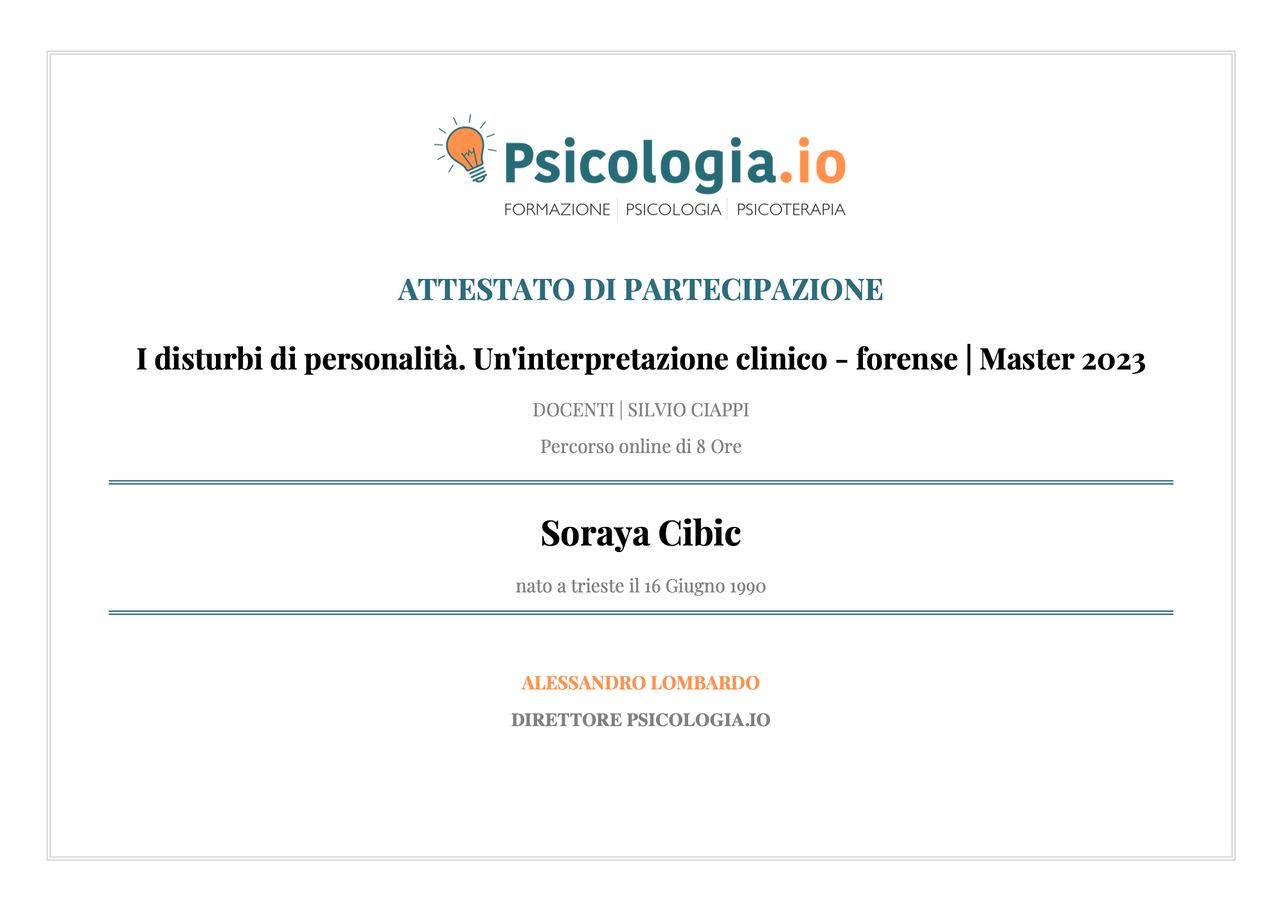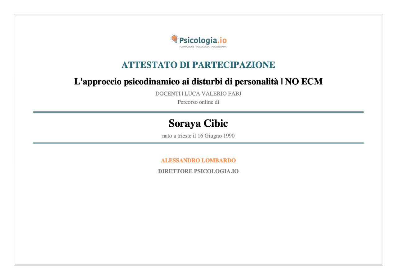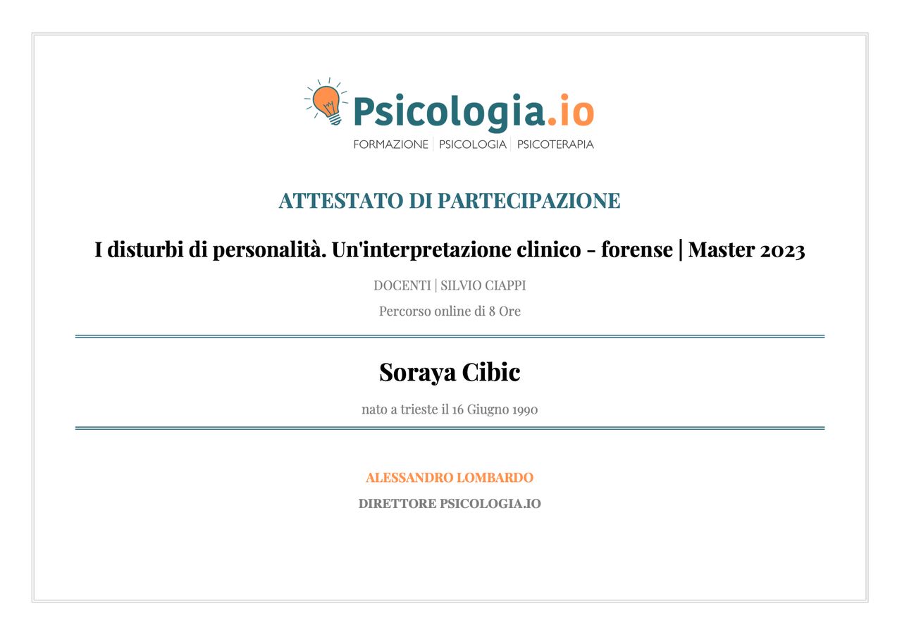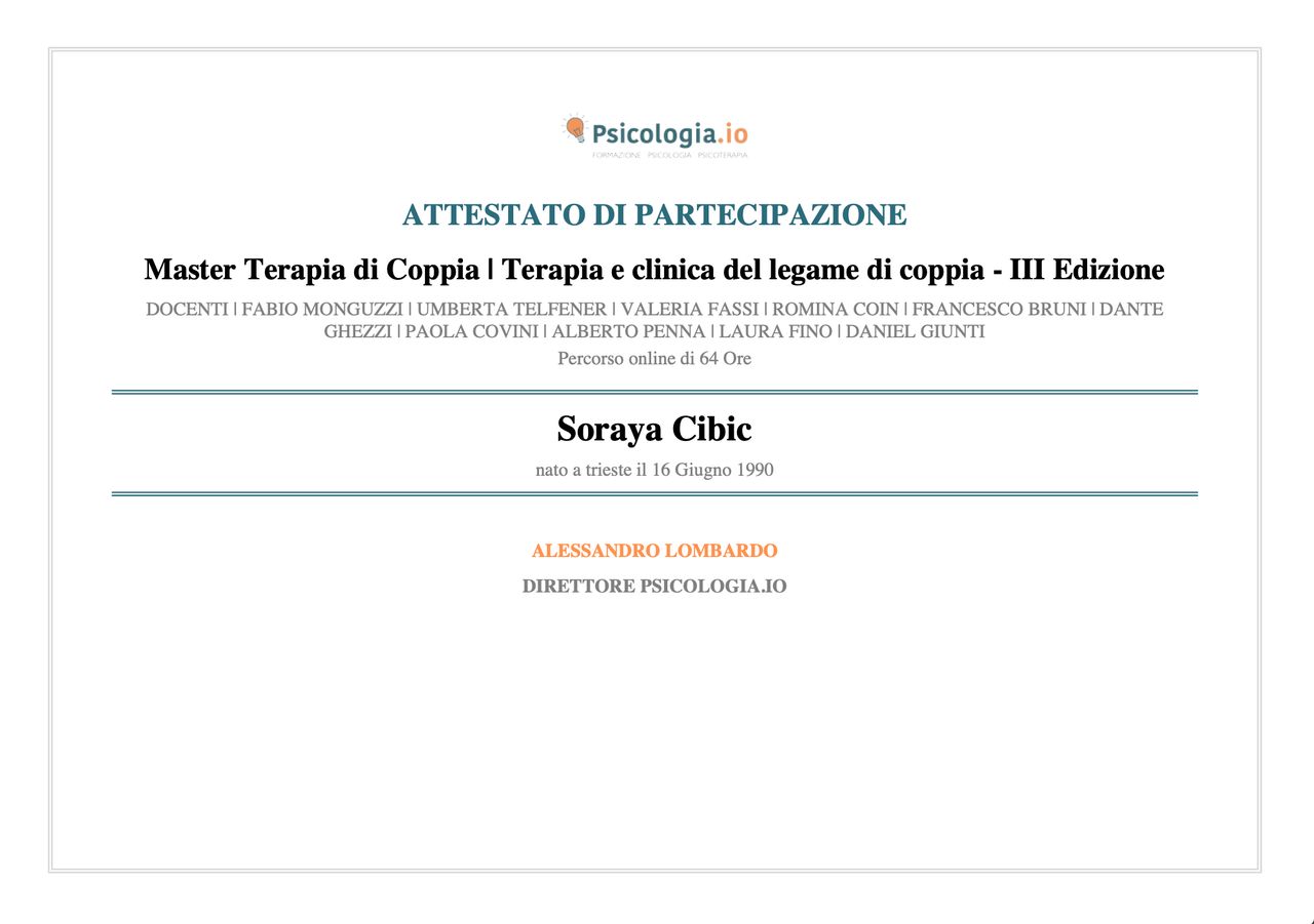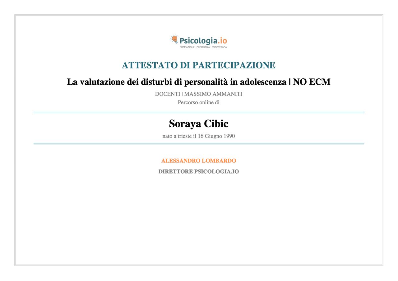 Sono la Dott.ssa Soraya Cibic, psicologa e psicoterapeuta.