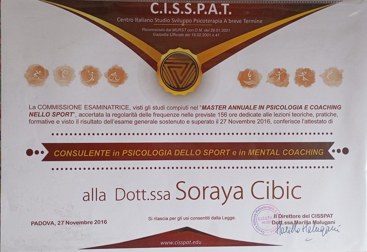 Sono specializzata anche in psicologia dello sport e dell'esercizio, per supportare atleti, allenatori o chi desidera migliorare il proprio benessere psicofisico o affrontare una riabilitazione dopo un infortunio o una malattia.